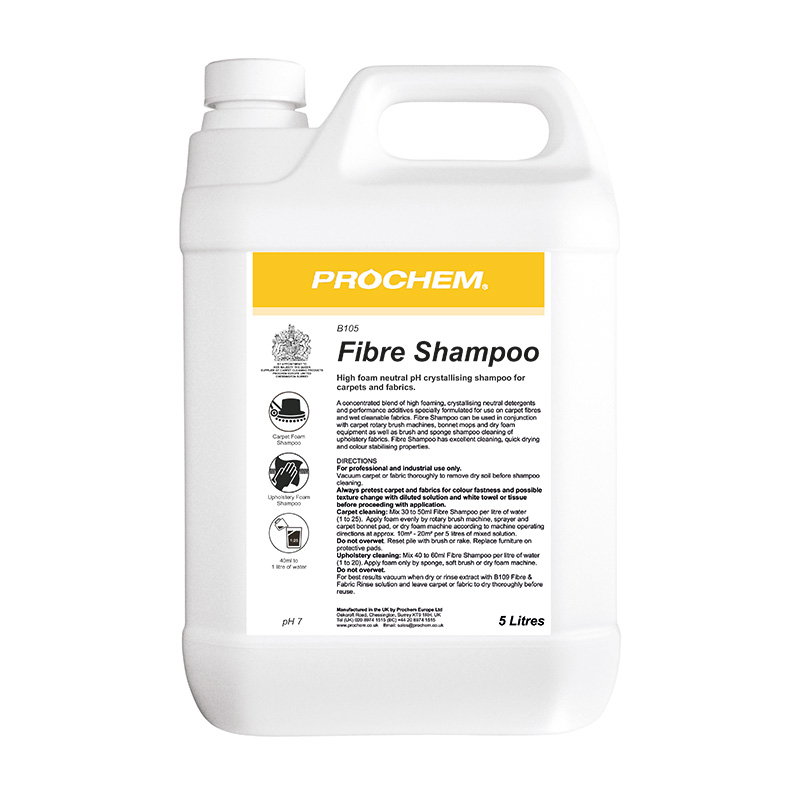 Professional high foam crystallising shampoo with micro-encapsulation formula, for carpet rotary, dry foam and hand cleaning of fabric upholstery.Fibre Shampoo contains a buffered pH system to help prevent browning and colour bleed and can also be used in conjunction with Prochem problem solver additives.Clear liquid with lemon and lime fragrance.