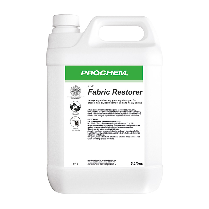 Premium upholstery pre-spray with high concentrate blend of detergents, low odour solvents and anti-resoil agents, for use on grease, hair oil and body contact areas of wet cleanable fabrics. Clear liquid with citrus fragrance.