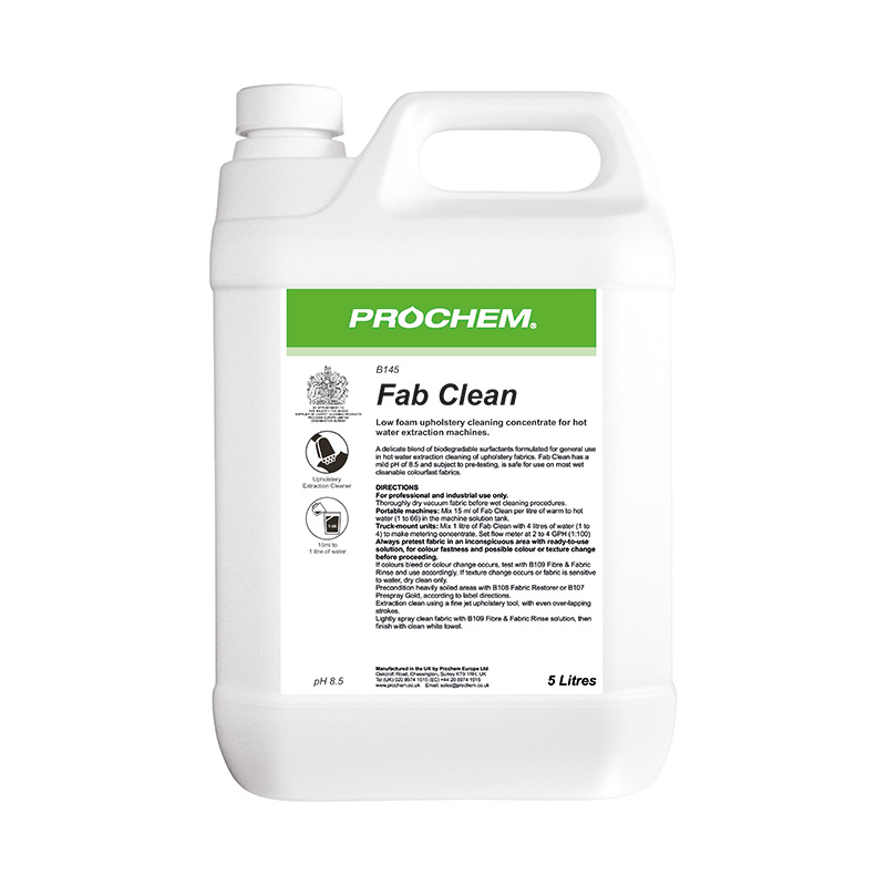Upholstery fabric extraction concentrate for use on wet cleanable colourfast fabrics.Contains a unique blend of low foam biodegradable surfactants.Turquoise liquid with green apple fragrance.
