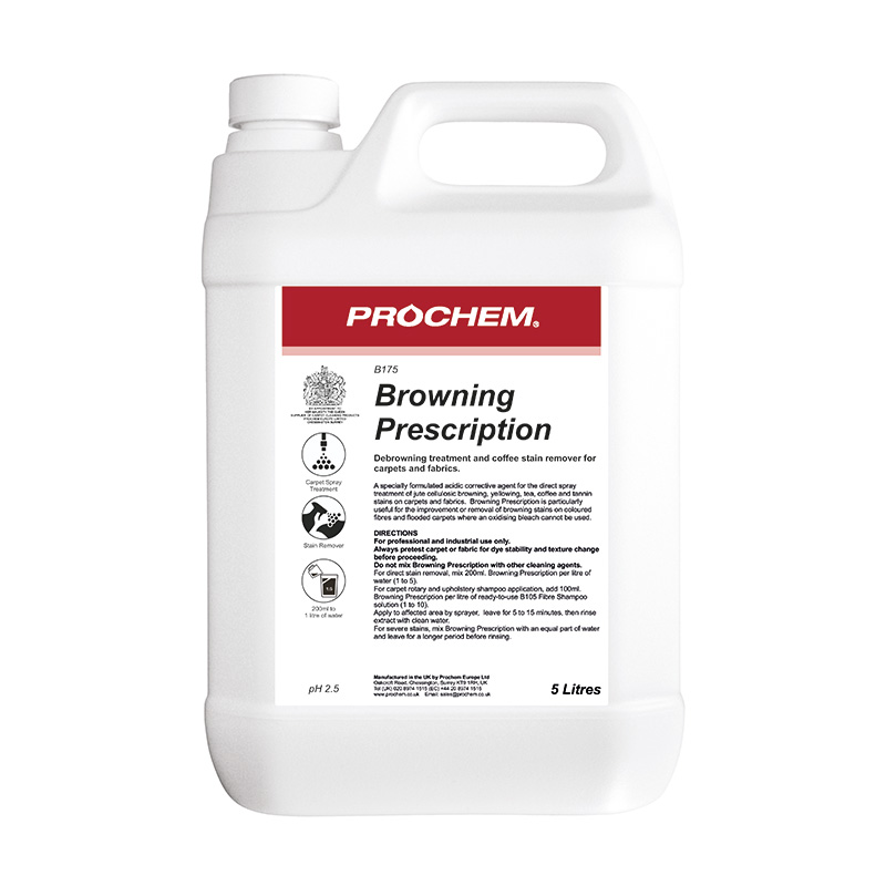 Special formula for treating jute browning and large areas of water damage staining on carpets.Contains anti-browning and anti-yellowing agents.Dilute with water and apply by sprayer or add to B105 Fibre Shampoo for rotary brush application, then extract with water.Clear liquid.