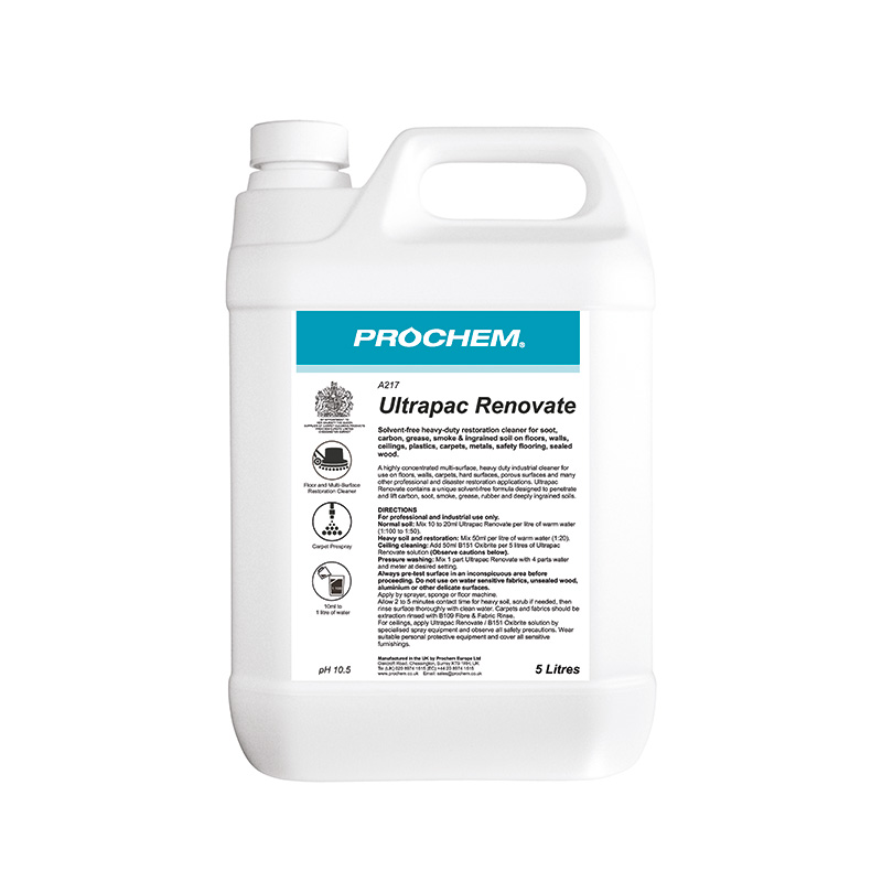 A highly concentrated multi-surface cleaner and pre-spray product for the removal of dry soot, carbon, fire residues, filtration soils, ingrained soils, rubber and draught marks on carpets, fabrics, hard and semi-porous floors and other surfaces. Highly effective on polypropylene (olefin) carpets as a pre-spray and in conjunction with B151 Oxibrite. Cationic solvent free formula "pulls out" soils by neutralising electrical charge and deodorises on application. Excellent cleaner for fire restoration and safety flooring.