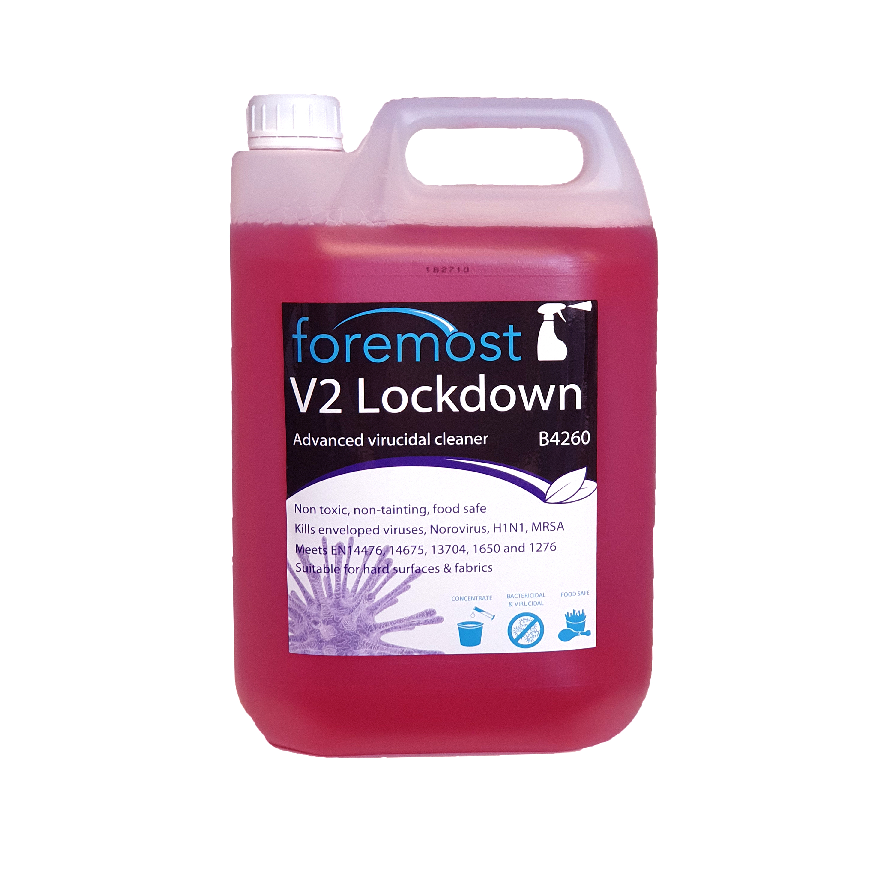 V2 Lockdown cleans and sanitises frequently touched items such as door handles, tables, banisters etc. and is suitable for damp mopping floors.