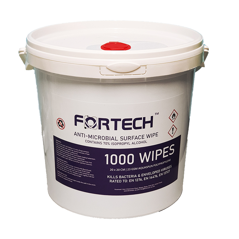 Fortech 70% alcohol wet wipes in bucket 1000sh 20x20cm EN 14476