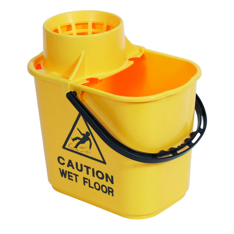 Professional 15lt mopstrainer bucket with safety msg Yellow