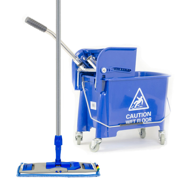 Blue flat mop kit contains bucket, frame, head and handle