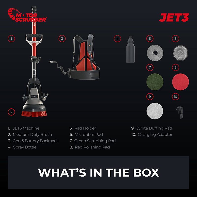 MotorScrubber Jet3 makes light work of deep cleaning confined and hard to reach places. Achieving outstanding cleaning results on any surface. Includes targeted spray-scrub technology to accelerate cleaning and release ingrained dirt.