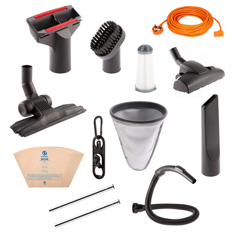 2x reusable bags, 5 disposable bags, 2 piece chrome wand, Combination floor tool (all surfaces), Crevice tool, Dusting brush, Upholstery tool