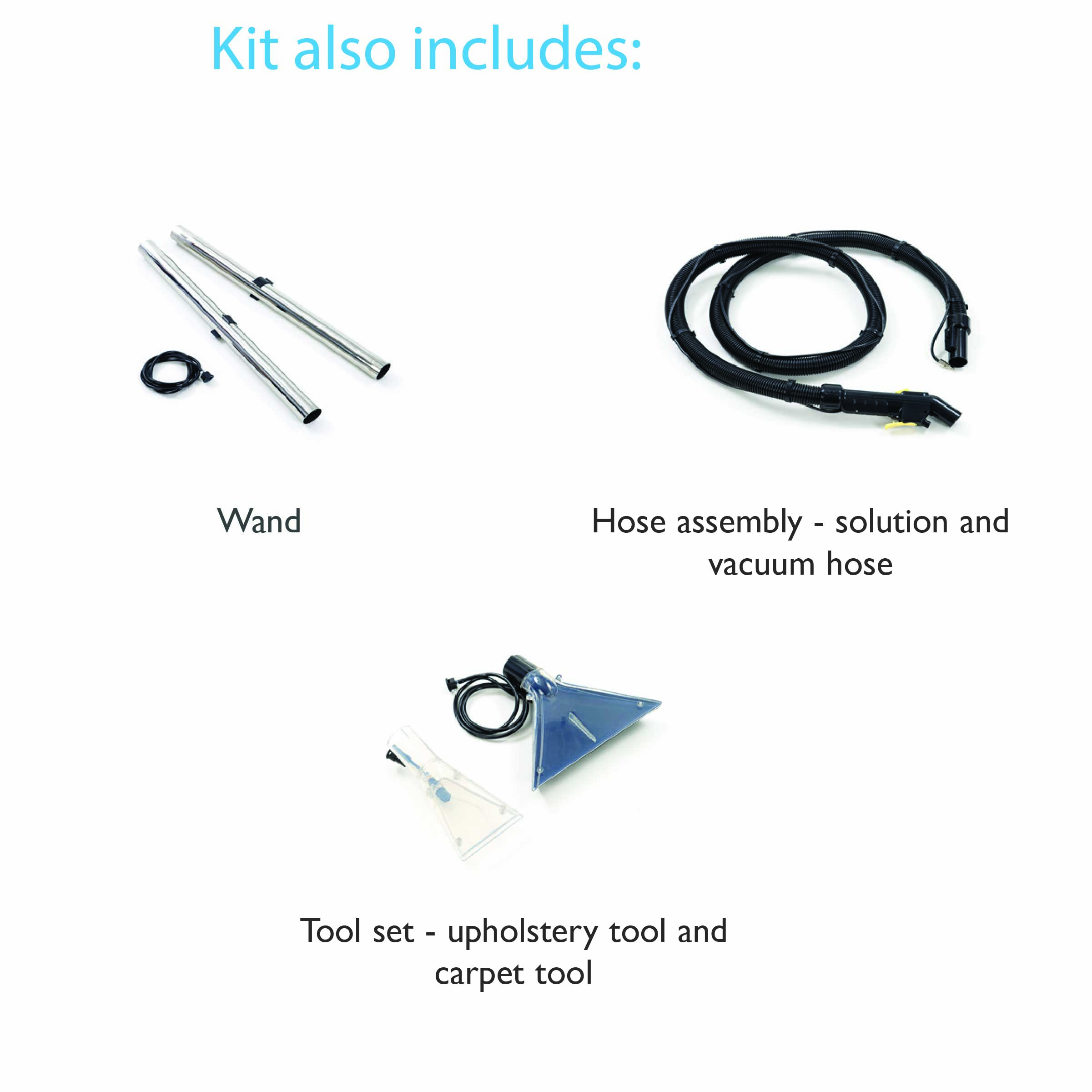 Comes complete with tools for cleaning carpets, upholstery and car interiors